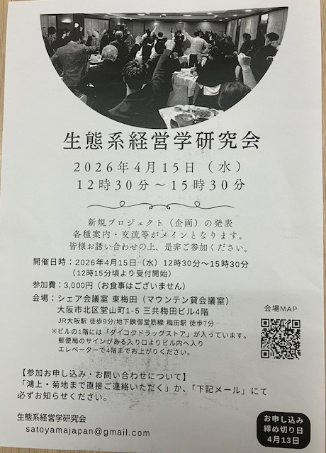 生態系経営学研究会で発表させて頂きます。 2026 4/10 お知らせ 2026年4月10日 アミノ酸醗酵資材に関する発表になります。有機農法、自然農法に関心をお持ちの方々にぜひぜひ参加していただければと思います。 お知らせ よかったらシェアしてね! URLをコピーしました! 元気な放線菌!! 関連記事 元気な放線菌!! 2026年3月12日 ほうれん草の硝酸態窒素の残留濃度での違い! 2026年3月6日 土丸くんで放線菌が出てきました。 2026年2月27日 根粒菌大調査 2026年2月18日 特許を取得しました。 2026年2月8日 土丸くん(Grace1) 一般販売開始しました。 2025年1月30日 有機農業マニュアル 2022年10月31日 アグリビジネス創出フェア2022 終了 2023年10月12日